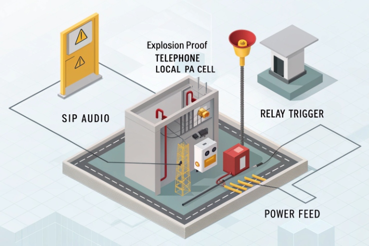 Many explosion-proof phones include a dry contact output. It can trigger a PA controller input, an external amplifier “remote enable,” or a siren module. This approach is reliable when the loudspeaker system is separate from the phone’s audio.