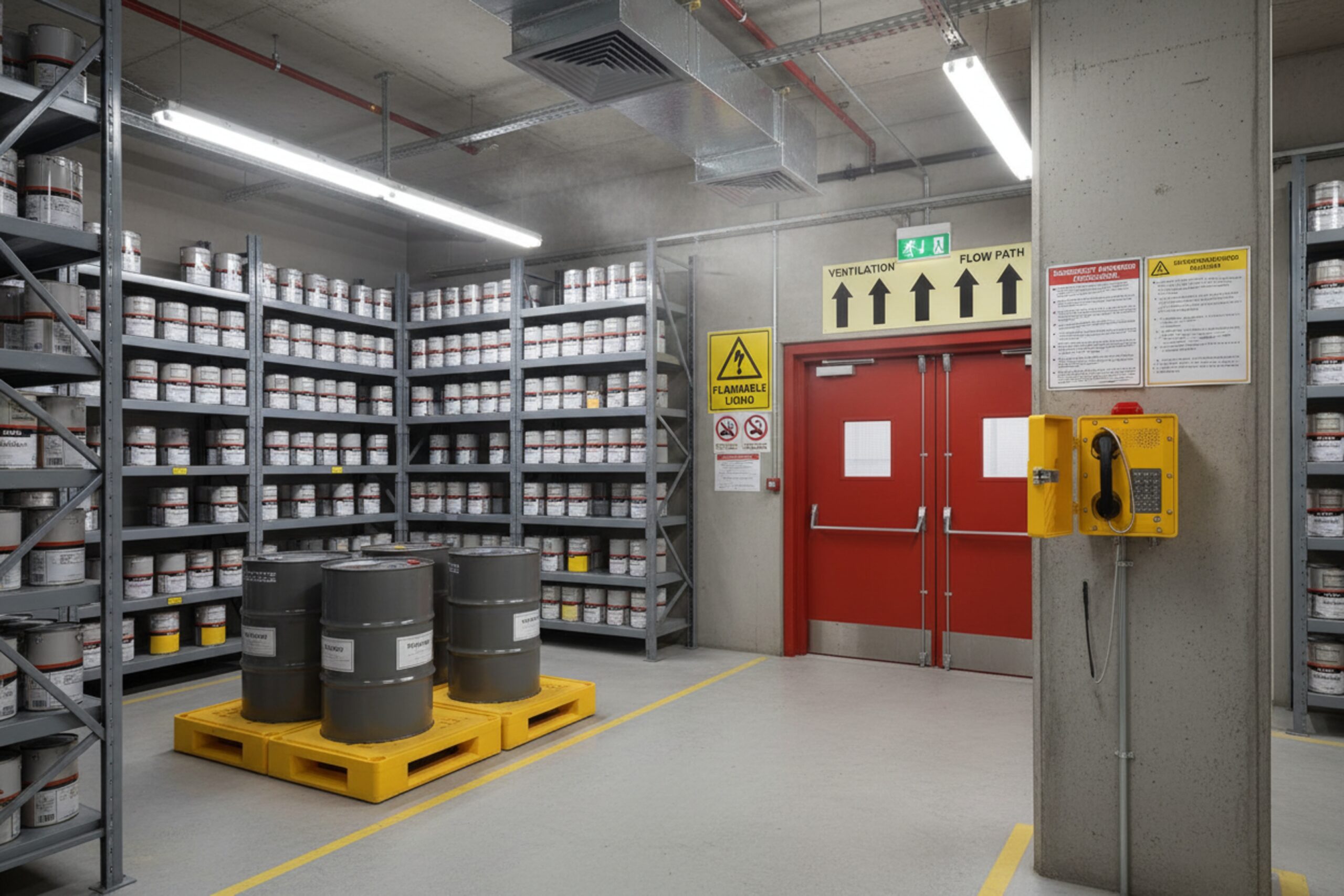 Paint storage rooms stay quiet until a drum leaks or a ventilation fan trips. Then
