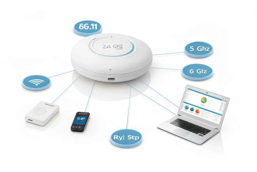 Wires tie devices down. Doors and lobbies move. Calls must follow people, not ports. Wi-Fi