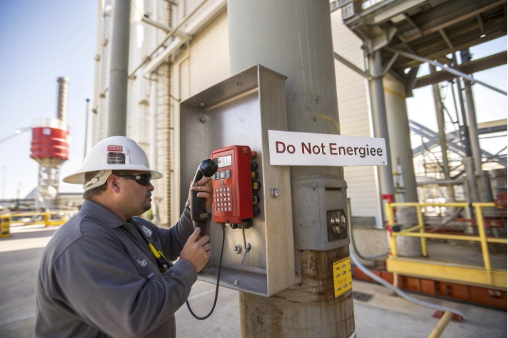 Rugged industrial wall telephone mounted beside pipelines along plant walkway
