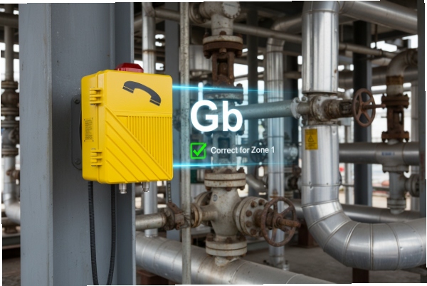 On explosion-proof telephones, “Gb” does not tell the full story by itself. It tells the level of protection against ignition in a gas atmosphere. The protection method is shown elsewhere on the marking, like Ex db (flameproof), Ex ib (intrinsic safety), or Ex eb (increased safety). A common field mistake is treating “Gb” like a standalone approval. It is not. It works only with the full Ex marking package, the certificate, and the installation rules.