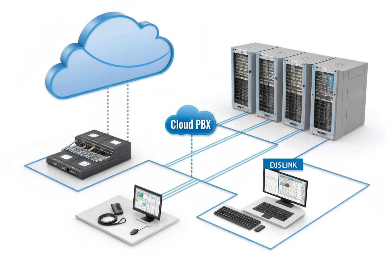Hybrid deployment showing on-prem gear connected to a cloud PBX cluster and a Djslink control workstation