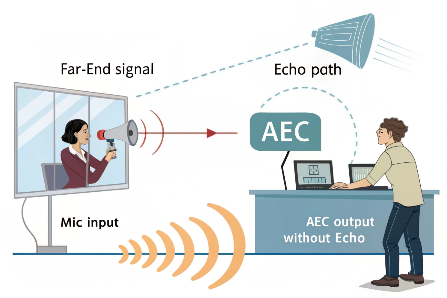 Acoustic Echo Cancellation (AEC) is a real-time audio process that removes far-end sound that leaks from a local speaker back into a local microphone. It models the speaker-to-mic echo path and subtracts a predicted echo so the far end hears only the near-end voice.