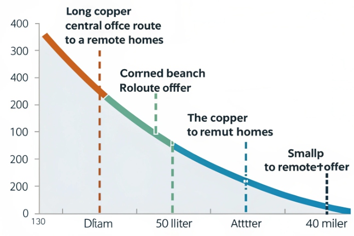 Copper has physics rules that no config can bypass. The longer the loop between the DSLAM and the modem, the higher the attenuation. At some point, high-frequency bins become unusable, so the modem drops them. Capacity falls. This is why a line at 500 meters might sync at 18 Mb/s down, while a line at 3 km from the same cabinet only reaches 5–6 Mb/s.