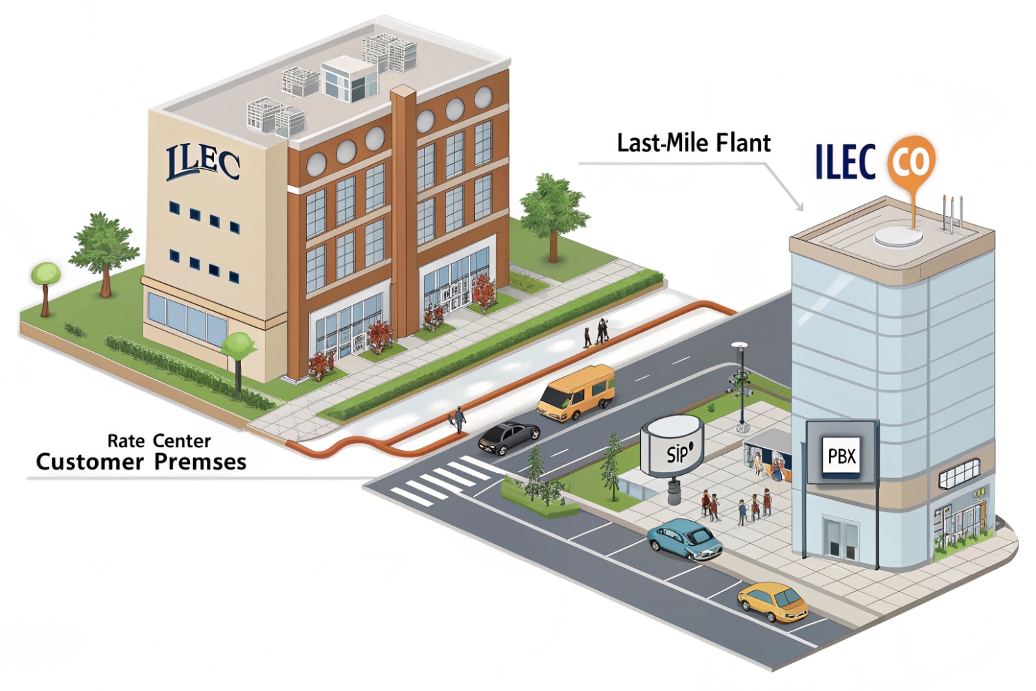 Isometric city scene showing an ILEC office at the rate center/customer premises connected by an orange last-mile plant cable along the street to an ILEC central office building with a PBX sign and SIP pedestal, cars and pedestrians nearby