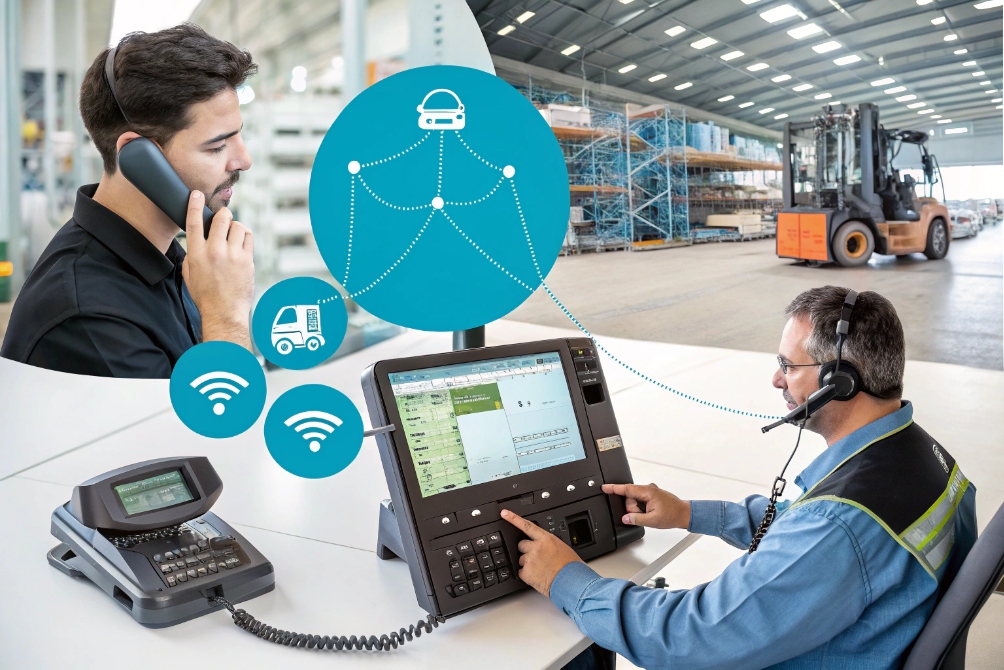 Reference image showing hands-free dispatch workflows using SIP phones and headsets. ↩ ↩