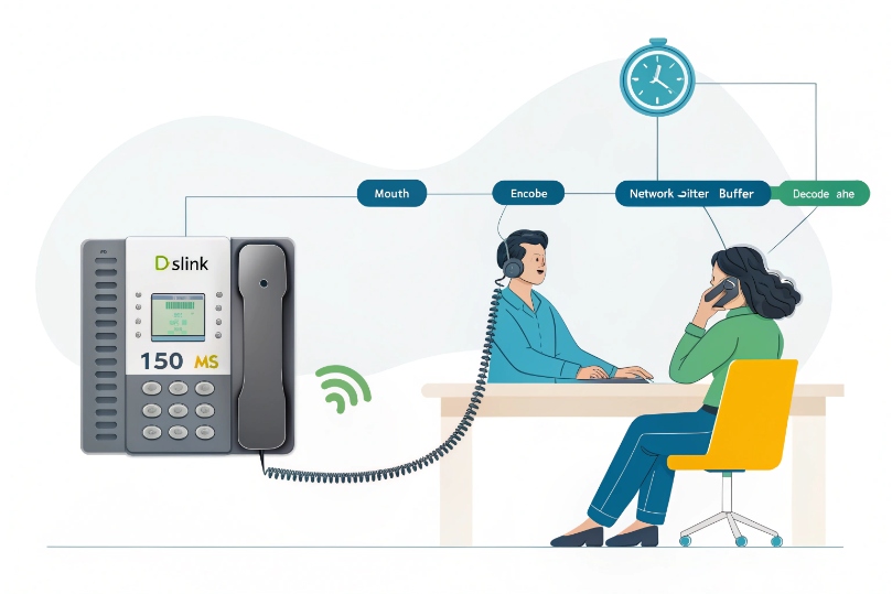 Latency is one-way voice delay from mouth to ear. Keep it ≤150 ms one-way (≤300 ms RTT). Reduce network hops, queue time, Wi-Fi contention, and oversized buffers to keep speech snappy.