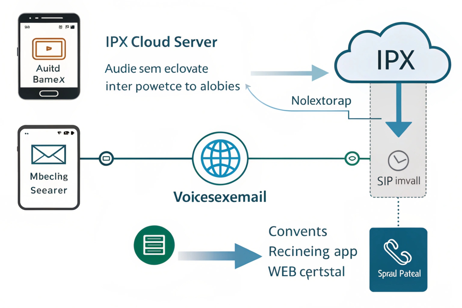 Mobile voicemail flowing via IPX cloud server and SIP voicemail into a unified voice-to-email service