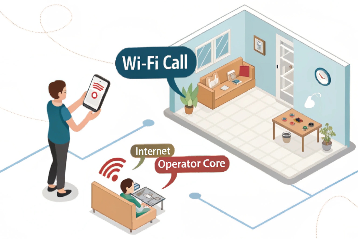 The Wi-Fi calling feature 1 (often called VoWiFi) is not the same as WhatsApp or Zoom. Your carrier still provides the calling service, your phone still uses the native dialer, and your normal phone number still appears. The difference is the access network. Instead of using a cell tower, your phone uses a Wi-Fi access point and home internet.